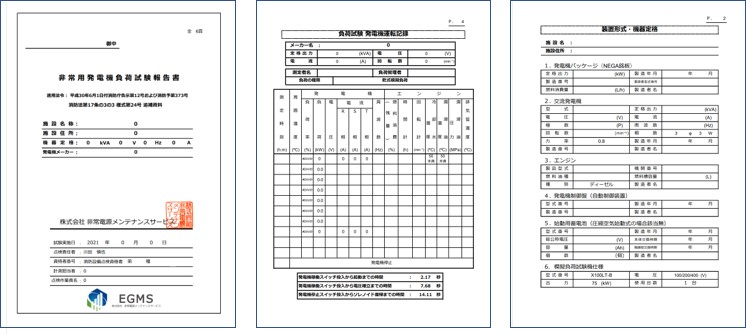 また、非常用発電機総合点検の内容を全てセットにした形での負荷試験も承っております。その場合は、上記の報告書に加えて点検票(その1~その3)の作成も有資格者により実施し併せてご提出致します。