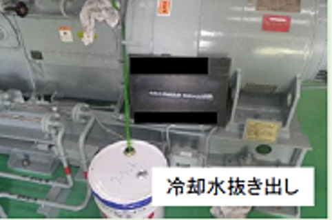 却水を必要量抜き取り、冷 却水の成分を確認する。 ⇒「PH」、「全硬度」、 「電気伝導率」、「蒸発残 留物」等が製造者の指定値 範囲内であることを確認する。 ※成分分析の結果、指定値 範囲外の項目がある場合に は、異常がある部位に清掃、 修理、交換等の必要な措置を講ずる。 |