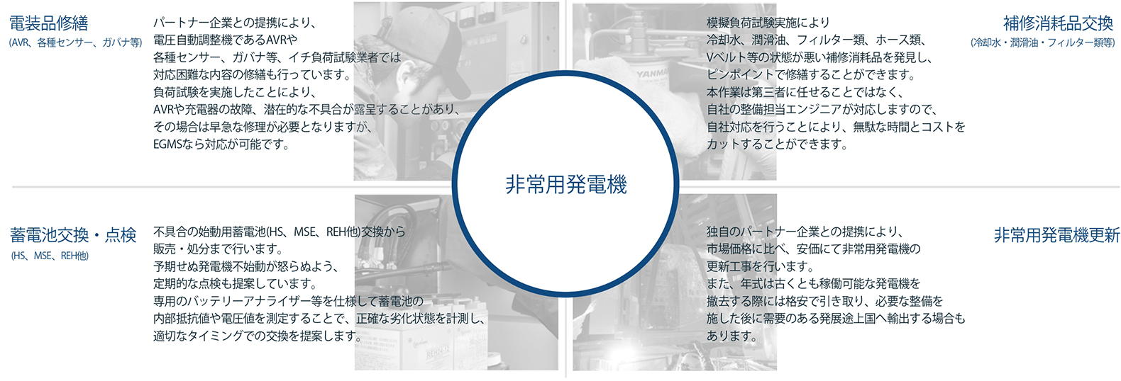 始動用蓄電池(HS/MSE/REH他)の交換・販売・処分を行います。予期せぬ発電機不始動が起こらぬよう、定期的な点検も提案しています。